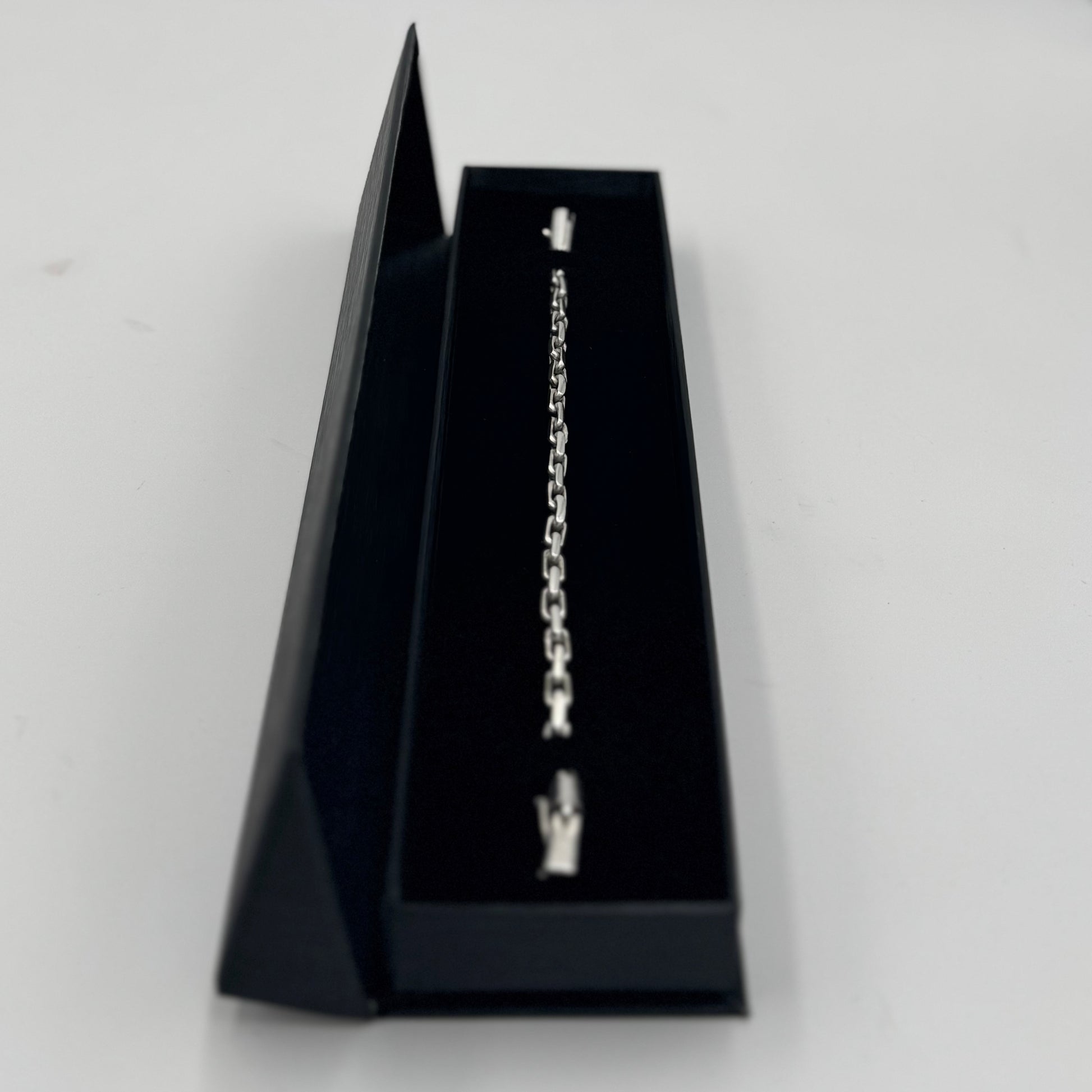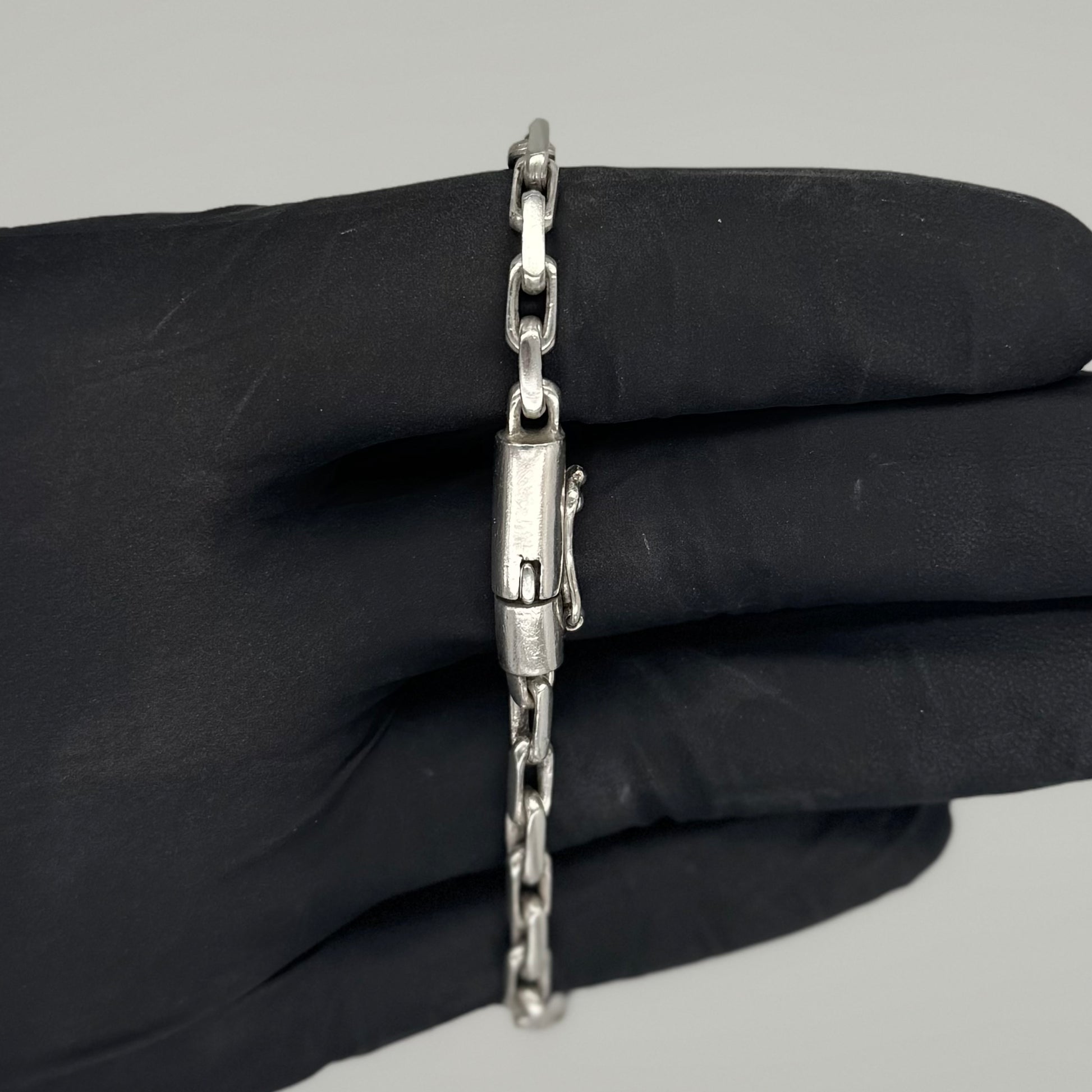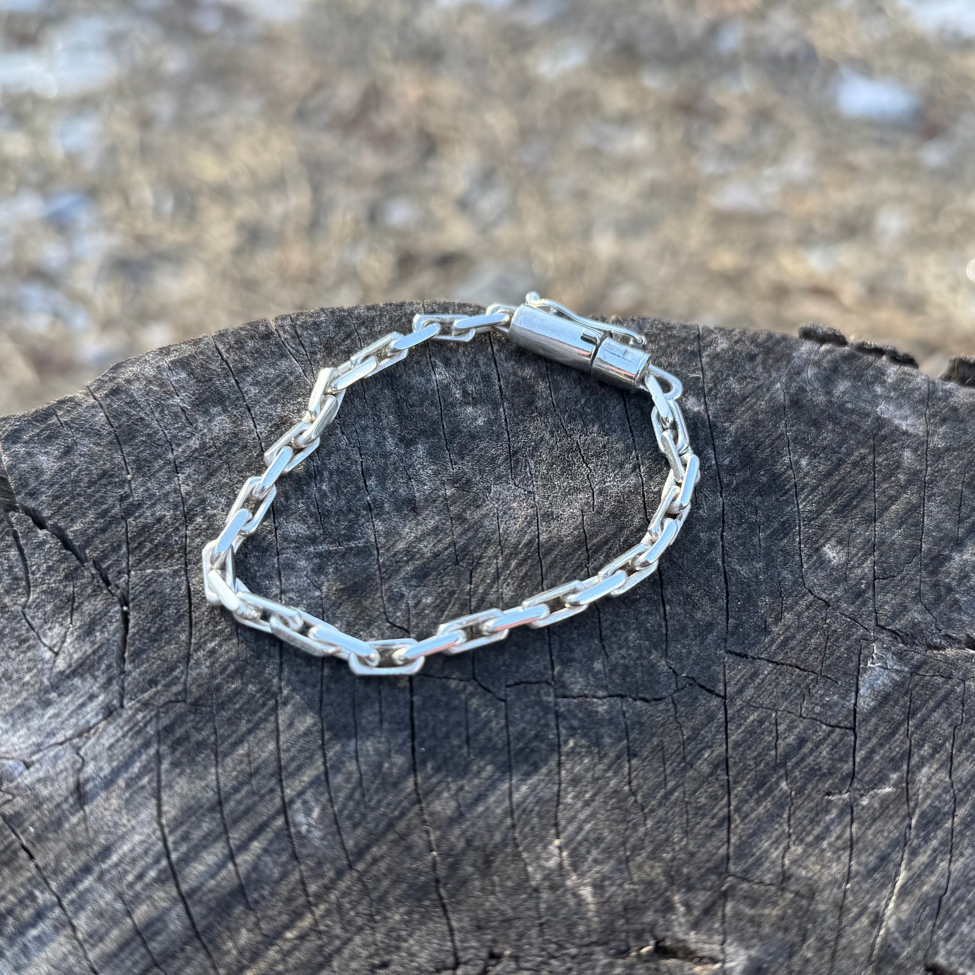 A sleek sterling silver cable chain bracelet with bold links and a clean modern clasp
